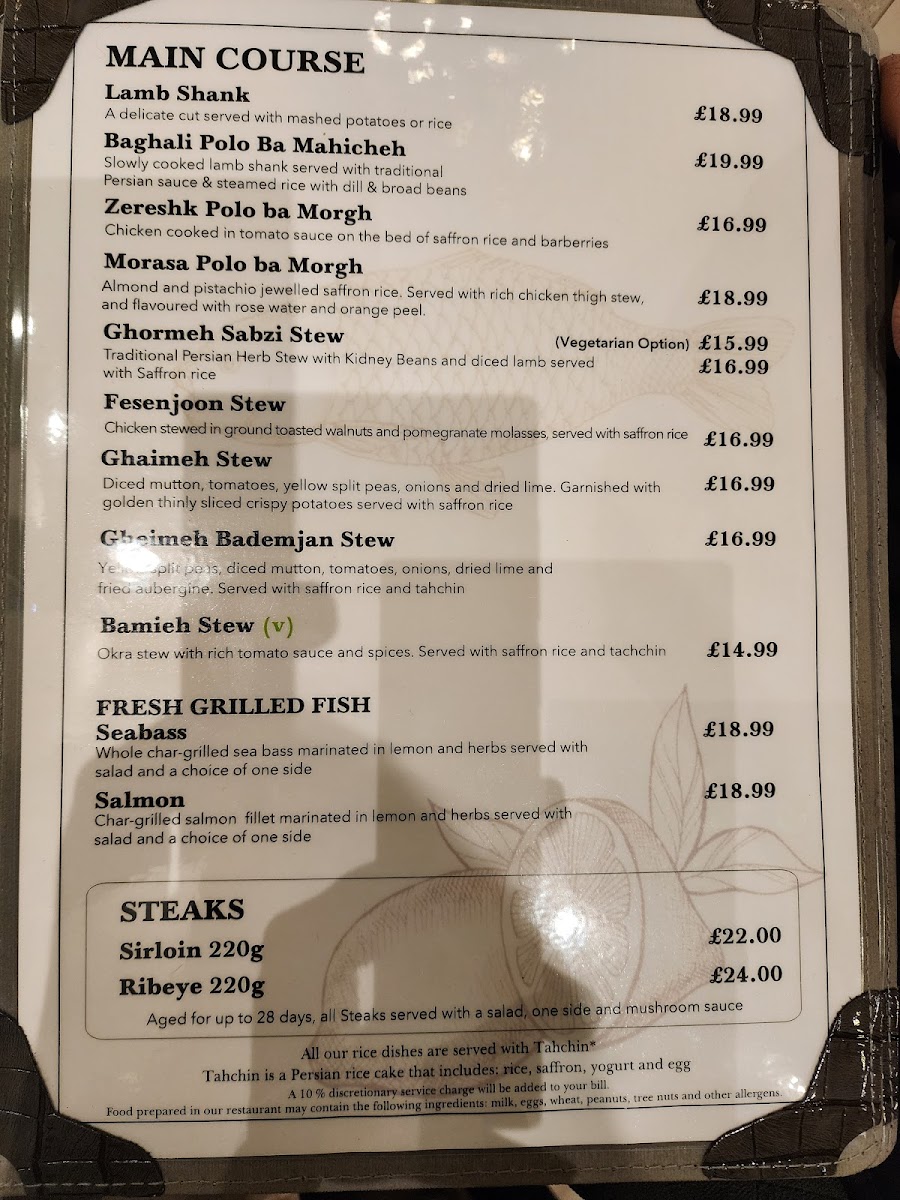 The menu is a delightful journey through traditional flavours, featuring tender Jojeh and Barg kebabs, expertly marinated to perfection. Don't miss out on the Kubideh and Chenjeh kebabs, with the latter praised for its tenderness and robust flavour. Each dish is served with aromatic rice and a delightful piece of tahchin, enhancing the dining experience.